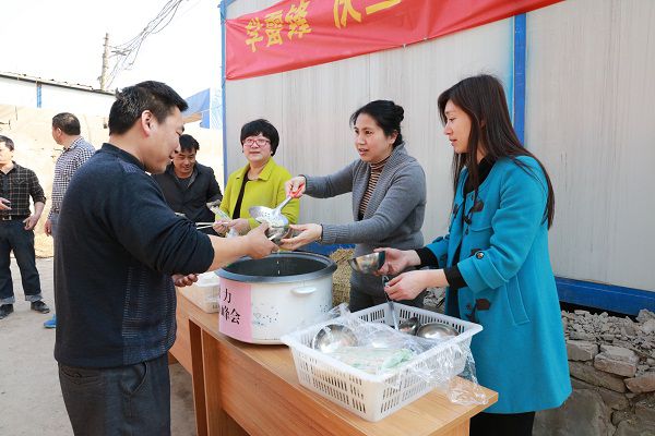 一直忙到下午一點(diǎn)半,所有的餃子和饅頭終于被分類打包完畢。在湘運(yùn)公司副經(jīng)理韓利明的幫助下,婦委工作人員們帶著滿滿一箱心意驅(qū)車(chē)前往湘湖三期湖面挖運(yùn)項(xiàng)目工地。湘湖三期湖面挖運(yùn)項(xiàng)目作為G20峰會(huì)保障重點(diǎn)項(xiàng)目之一,由長(zhǎng)運(yùn)公司下屬湘運(yùn)公司承建,預(yù)計(jì)到3月底前完工,此時(shí)工地上正是一片熱火朝天的忙碌景象。當(dāng)日天氣晴好,項(xiàng)目現(xiàn)場(chǎng)塵沙飛揚(yáng),被用作辦公室的臨時(shí)板房里異常悶熱。婦委的工作人員們一邊招呼工友們吃餃子、饅頭,一邊連連感慨:“工地上的條件實(shí)在太艱苦了!你們辛苦了!多吃點(diǎn)!”