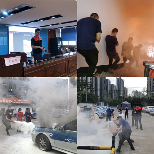 演練部分,一是樓道內(nèi)火災(zāi)的逃生演練,二是燃油出租車自燃后的滅火演練。