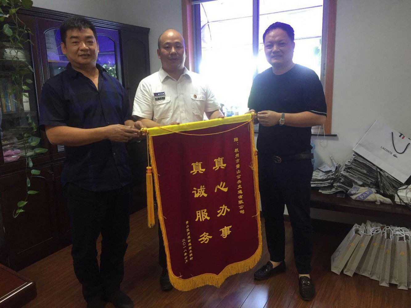 7月2日上午,盡管天氣炎熱,烈日當(dāng)頭,但聞堰街道辦事處以及老虎洞村委相關(guān)領(lǐng)導(dǎo)還是趕到了蕭山公交公司,一番奔波只為送面錦旗表示對蕭山公交的感謝。公司領(lǐng)導(dǎo)予以接待,并感謝其對我司的認(rèn)可。聞堰街道辦事處以及老虎洞村委相關(guān)領(lǐng)導(dǎo)表示,1599路開通極大地方便了廣大市民出行。他們對企業(yè)這種為民辦實(shí)事、辦好事的做法表示深深的感謝和高度的認(rèn)可。公司領(lǐng)導(dǎo)表示,蕭山公交將以滿足市民出行為根本出發(fā)點(diǎn),不斷優(yōu)化公交網(wǎng)絡(luò),解決市民出行需求,為蕭山區(qū)市民服務(wù)好,讓政府放心、讓市民歡心。